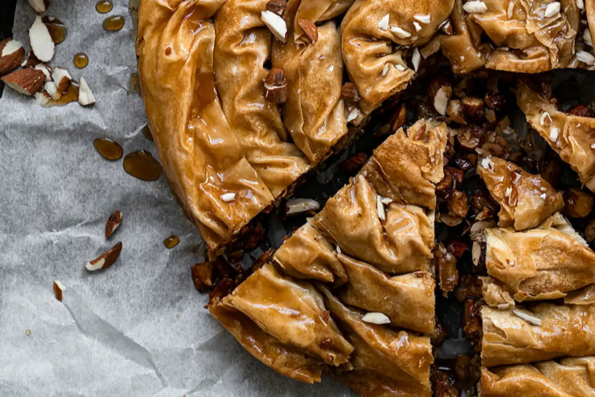 Den Ofen dabei auf 170°C vorheizen und die Baklava darin für 35-40 Minuten goldbraun backen. Währenddessen vermischt du den restlichen Honig mit 125ml Wasser in einem Topf, lässt das Ganze kurz aufkochen und danach für 10 Minuten köcheln. Zum Schluss einfach den frischen Espresso hinzufügen.