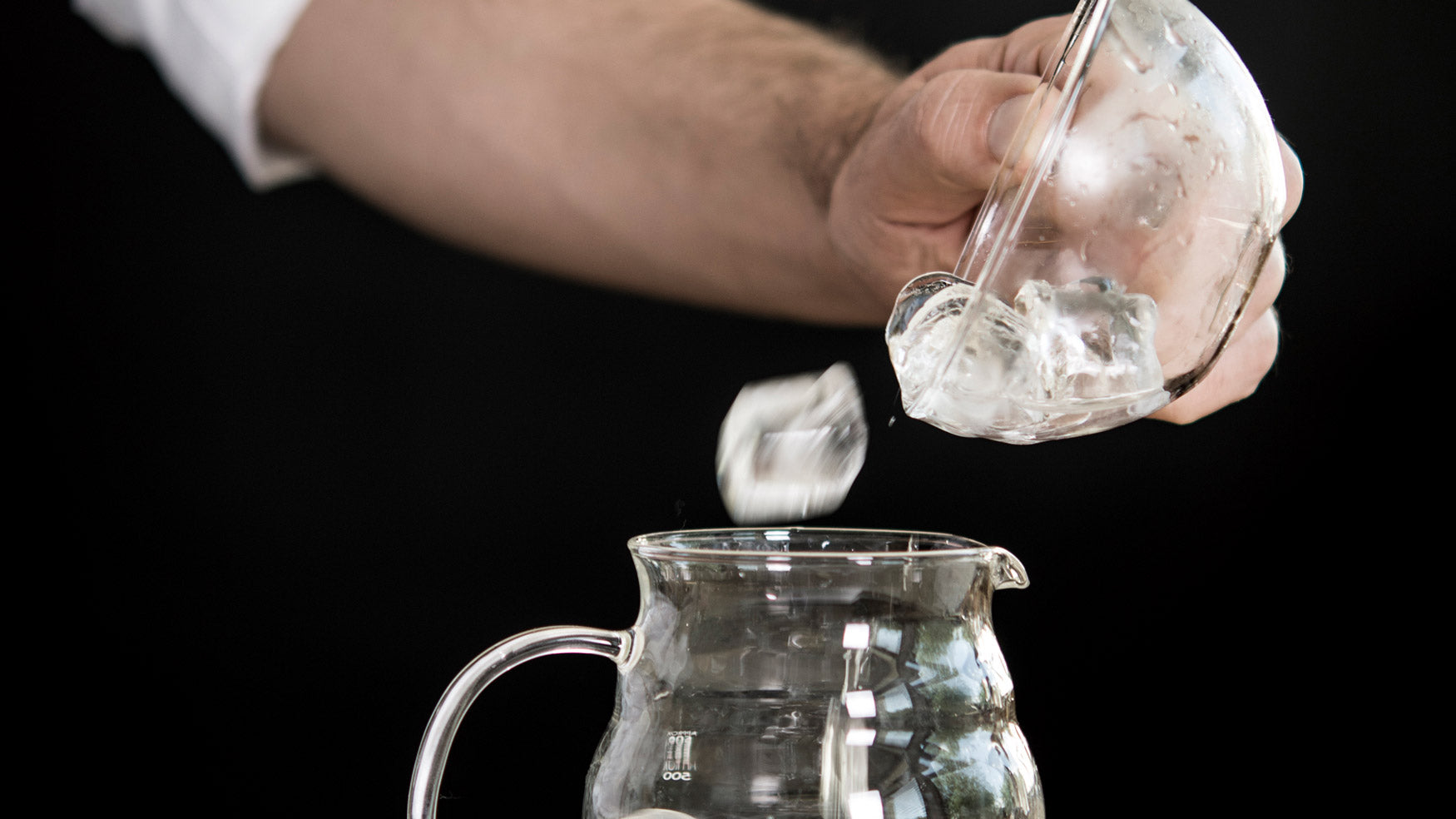 Was wäre Iced Coffee ohne Eis? Für die japanische Version sind ca. 170 Gramm Eiswürfel nötig. Diese geben wir in die Kanne, nachdem der Filter im Glass Dripper mit heißem Wasser gespült und der Server entleert wurde.