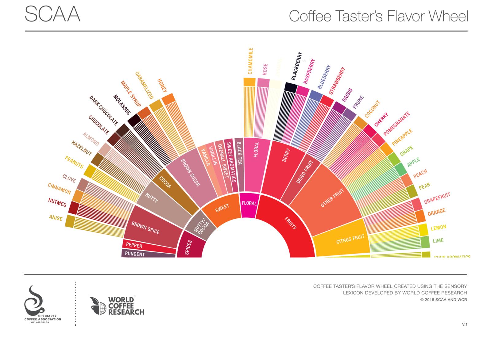 Das "Geschmacksrad" oder "Flavour Wheel" wurde von der amerikanischen Specialty Coffee Association entwickelt. Es hilft beim Verkosten von Kaffee dabei, die verschiedenen Aromen und Geschmäcker besser zu beschreiben und in Worte zu fassen. Das Wheel ist so aufgebaut, dass man sich von innen nach außen durcharbeiten kann. Im Inneren sind die übergeordneten Aromagruppen angeführt. Je weiter man nach außen gelangt, desto eher werden sie in detailliertere Geschmäcker eingeteilt. Wenn du noch nicht so oft "gecuppt" hast, solltest du dir davor immer das Flavour Wheel ansehen, um dir die verschiedenen Aromen in Erinnerung zu rufen. Das hilft dir dabei, den Kaffeegeschmack und das Aroma in Worte zu fassen und zu definieren.
