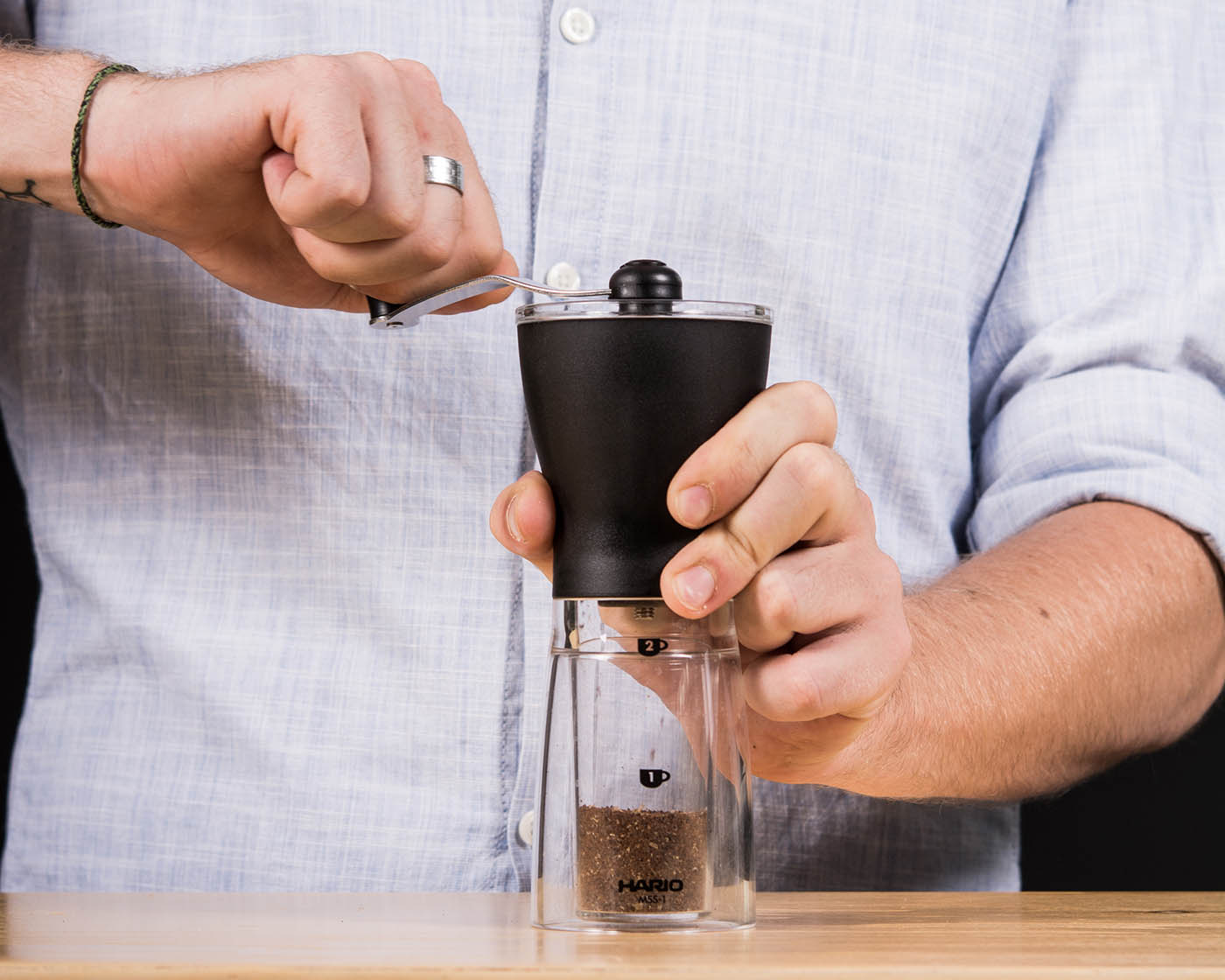 Für den privaten Gebrauch ist die Handmühle eine preiswerte Alternative. Gute Modelle gibt es bereits ab 30 Euro. Der Mahlgrad lässt sich zwar nicht ganz so fein justieren wie mit einer Espressomühle, man hat aber mehr als ausreichend Spielraum. Wenn du verschiedene Zubereitungsmethoden ausprobieren möchtest, sind Anpassungen mit einigen wenigen Handgriffen möglich. Außerdem sind solche Mühlen meistens kompakt, besonders praktisch und funktionierten ohne Strom. Du kannst sie deshalb auch überall mitnehmen.